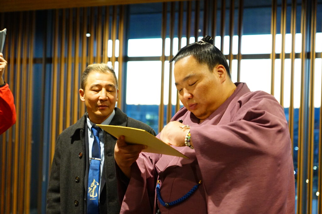 みんなで応援しているので、さらに大きな相撲取りなって活躍する姿を見せてほしい。』と染谷市長よりお言葉を頂きました。