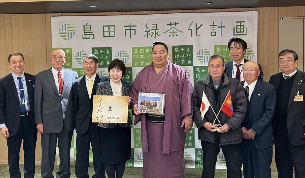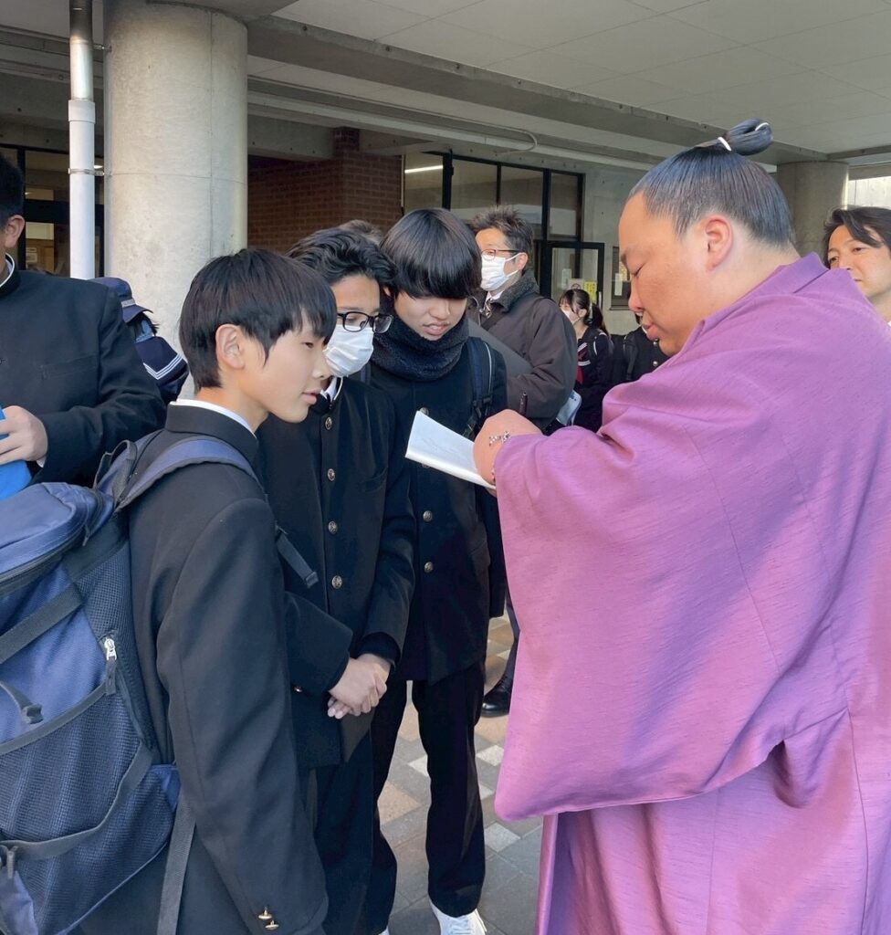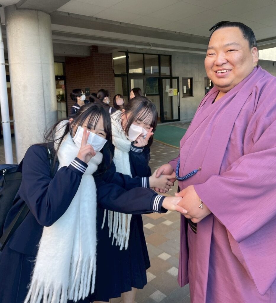 2026年1月の大相撲初場所より十両に昇進したモンゴル出身の出羽ノ龍関(本名=トムルバートル・テムレン)が、1月30日島田第一中学校を訪問しました。同中学校と姉妹校である、モンゴルナラン外国語学校の生徒として12年前に来島。今回「夢を持って頑張って欲しい」と生徒に呼びかけました。