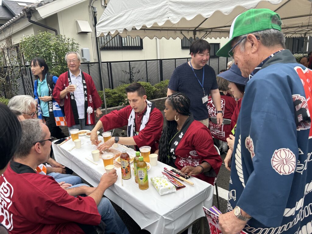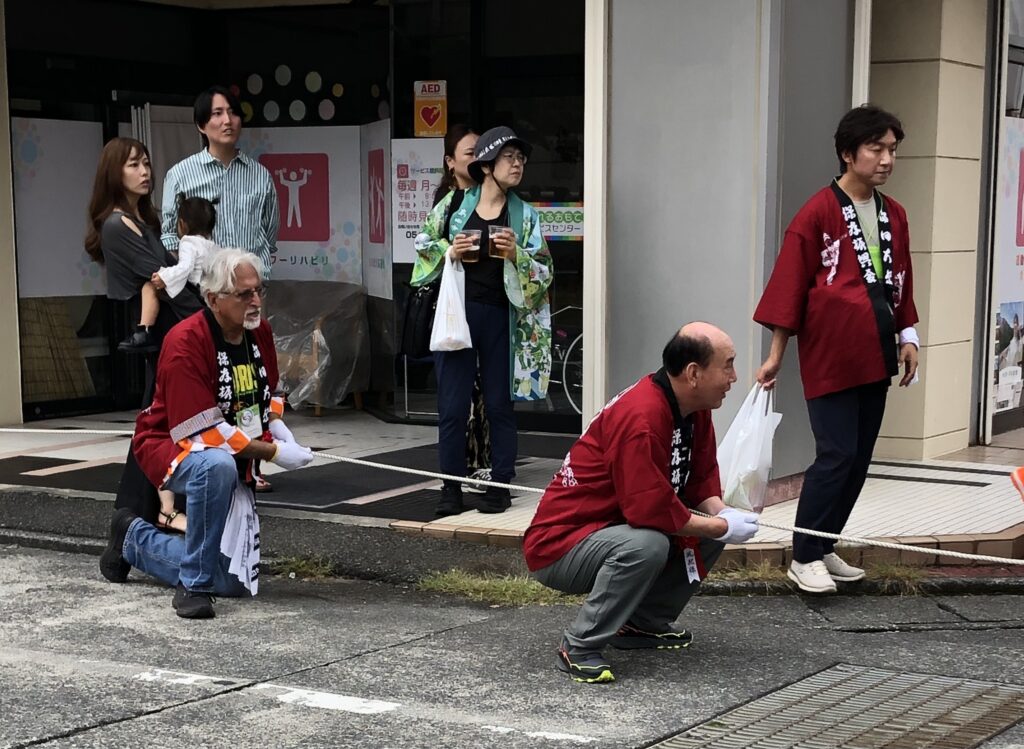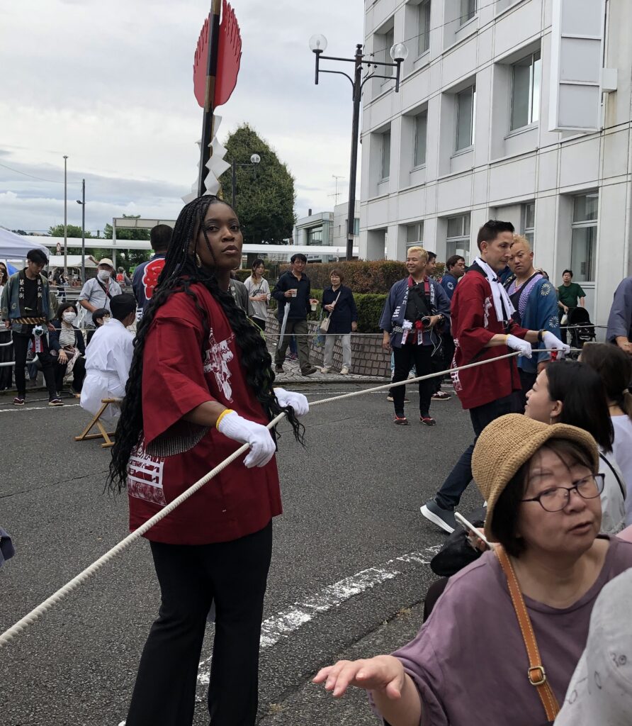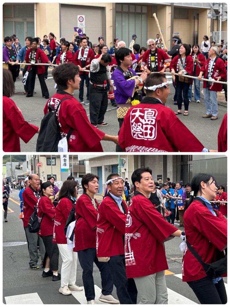 屋台の上踊りを見学し、大奴と大鳥毛と写真を撮ったり、法被を着て街(がい)の手ぬぐいを首に巻き屋台引きの体験をしました。