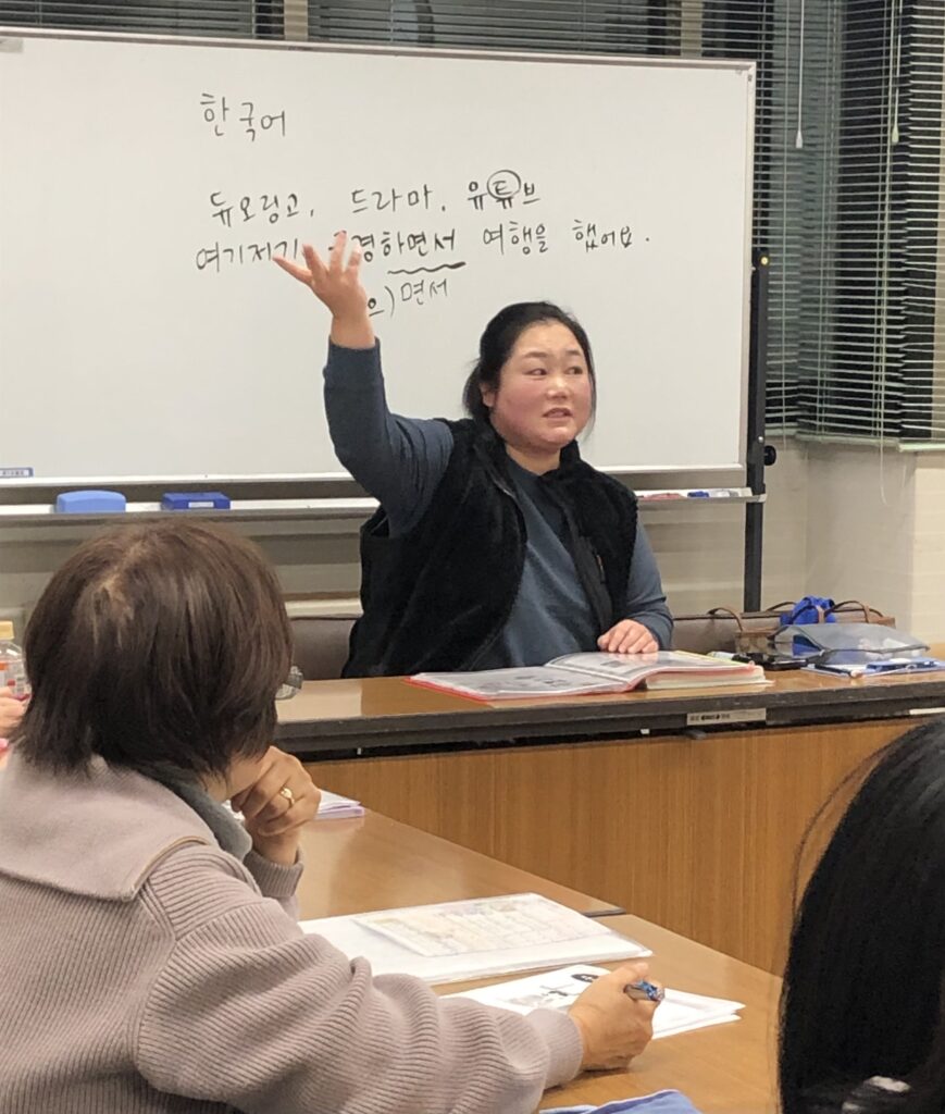 先生が「ピアノ」と言えば生徒さんは韓国語で答え、「唄う」を韓国語の丁寧語に直すと?と言えばそれを答える。